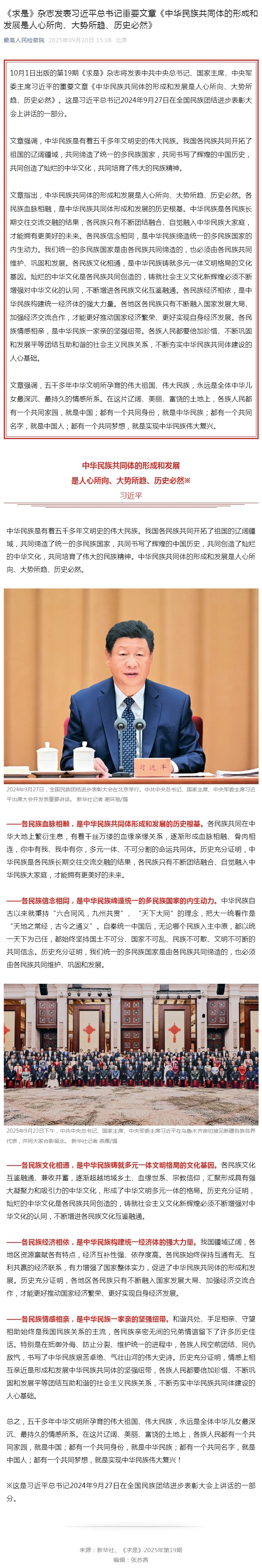 《求是》杂志发表习近平总书记重要文章《中华民族共同体的形成和发展是人心所向、大势所趋、历史必然》